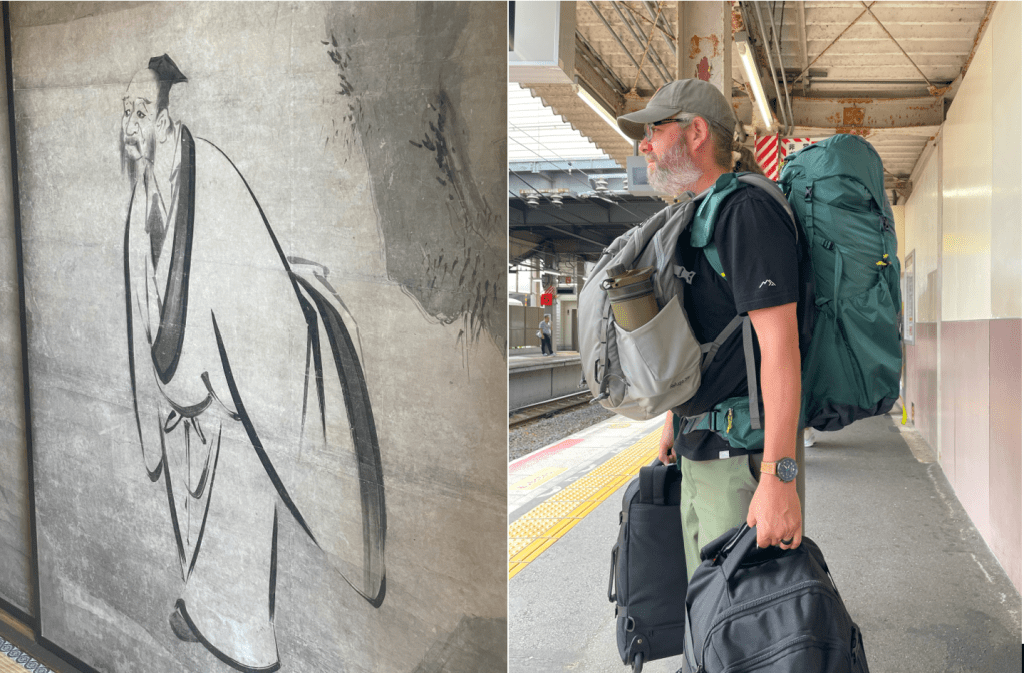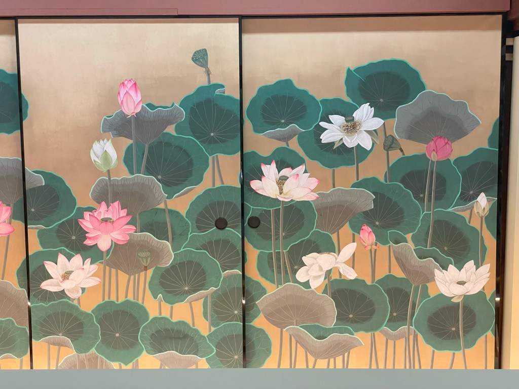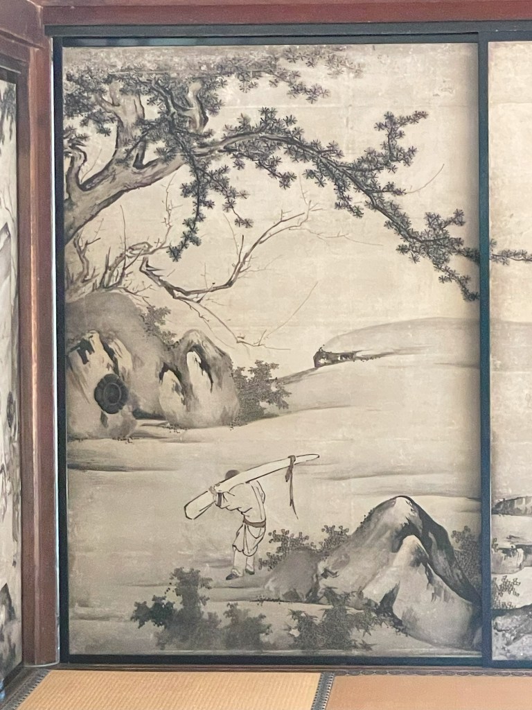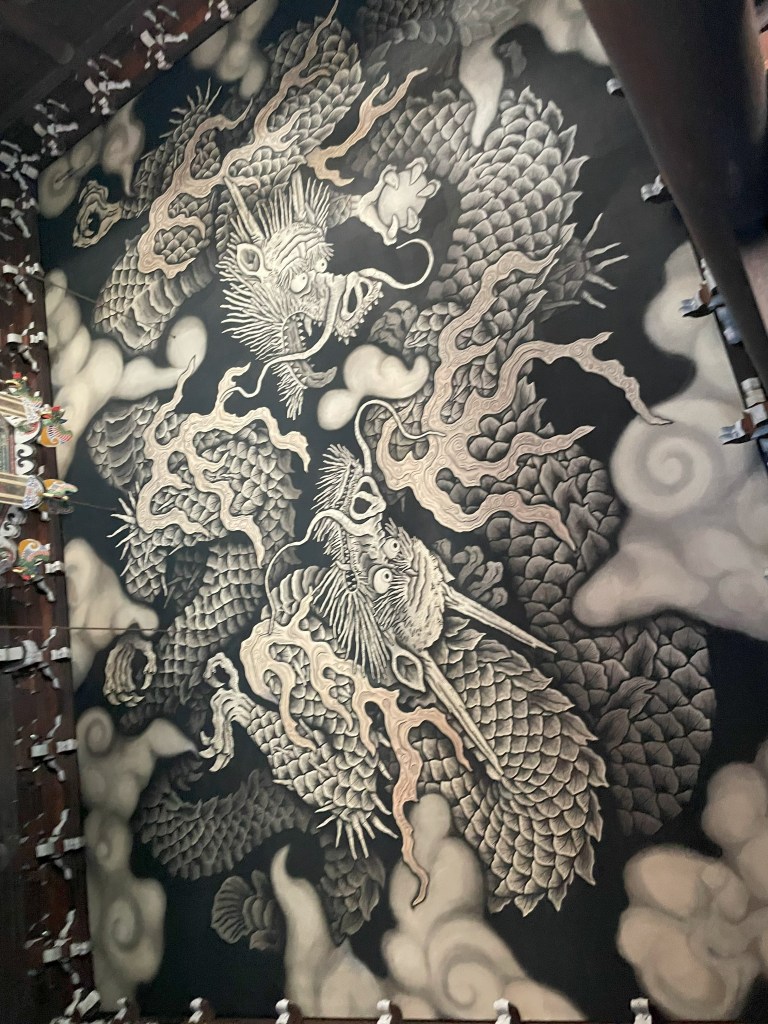 Later that day we visited another temple, Kennin-ji Temple. The artistry was again amazing. Although the statues of their buddhas were beautiful, I found the ceiling and wall paintings stunning. The dragons on the ceiling are relatively modern paintings (the dragon with its mouth open reminds me of our dog Pepper when he yawns), however the wall paintings are several hundred years old. You can see a recreation of those flowering lotuses from the bamboo forest, as well as an artist’s rendition of me being Daddy Sherpa centuries later (how did the artist know?).