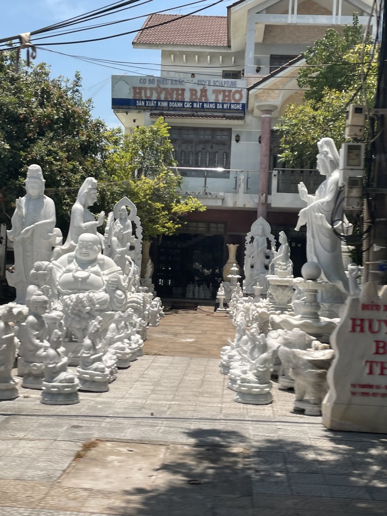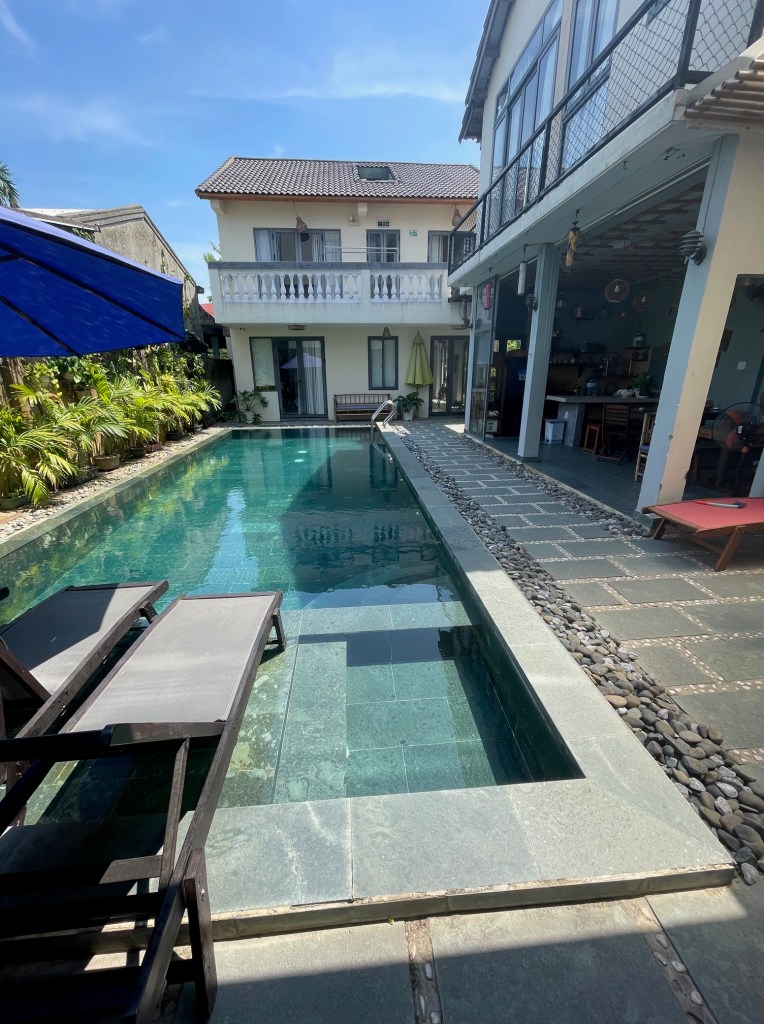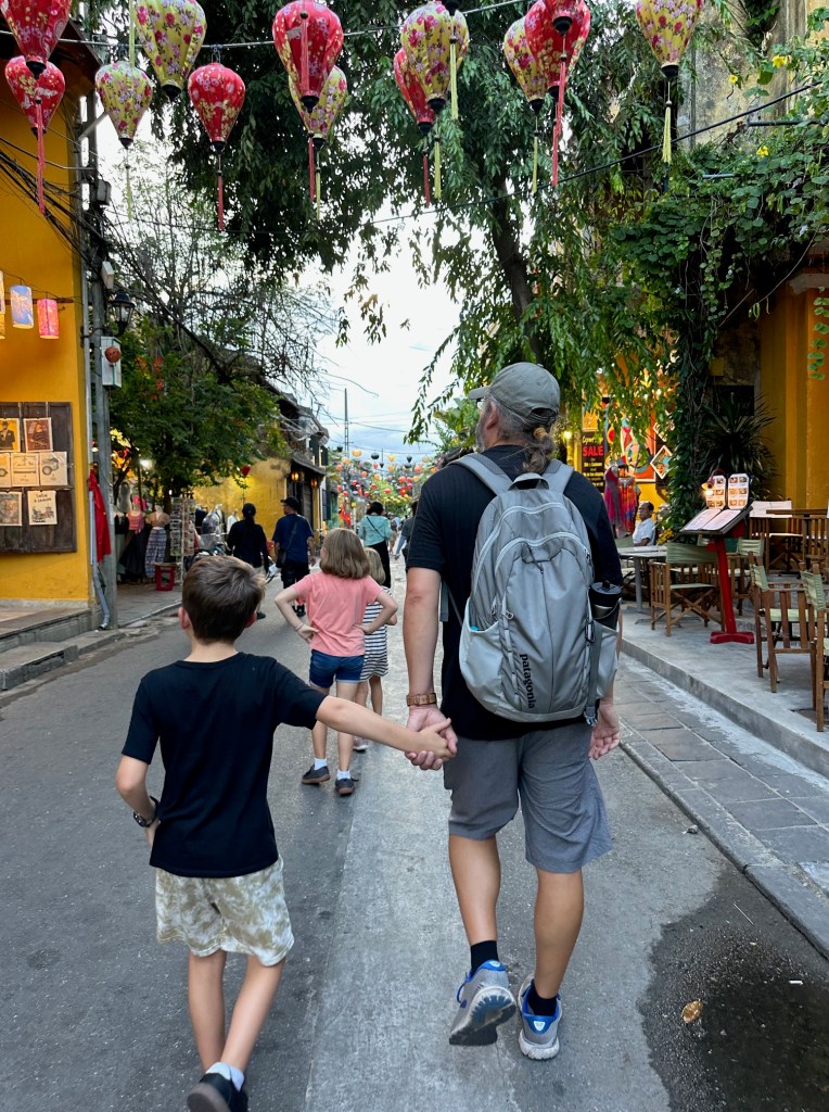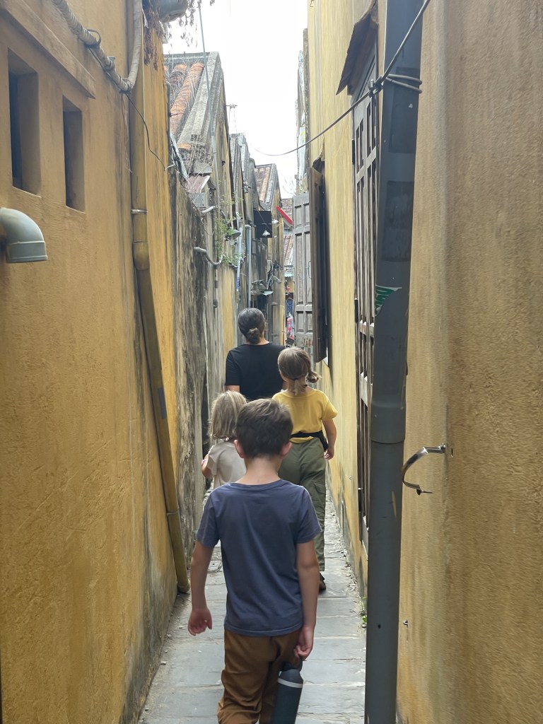 We’re not quite sure what to expect when we arrive at the Da Nang train station. It’s another bustling city, however this time we are destined for a more of a rural area called Hoi An. The taxi driver takes us down a road where there a hundreds of large, and I’m talking large, statuses of made of marble. LOTS of Buddhas, lions, even mermaids. We would become accustom to these figures as this road will be one we will frequent often when we attend Da Nang International Church on Sundays. The driver gets into town and turns down a very narrow road, finally stopping at our next home. We arrive at a villa with a shared pool, a nice reprieve from the big cities that we had been spending our time in up to this point. The villa has bikes available for use, where a child seat would soon be fastened so that Little Pea could take rides with Daddy Pea on grocery runs (usually a minimum of 3 stores visited on each run). Over the next three weeks all stress and worry that I had been storing up would dissipate. The worry of work, that I was no longer doing mind you, would finally, finally leave me. The worry about if the kids would adapt had mostly subsided, they were getting along better than I expected. The worry of being in a foreign land, of how to communicate and to get around, on if the locals would treat us as true outsiders, started to fade away. This place is a peaceful place. Slow, and relaxed. Inexpensive yet rich in beauty and culture. Man I could see myself getting used to this place.