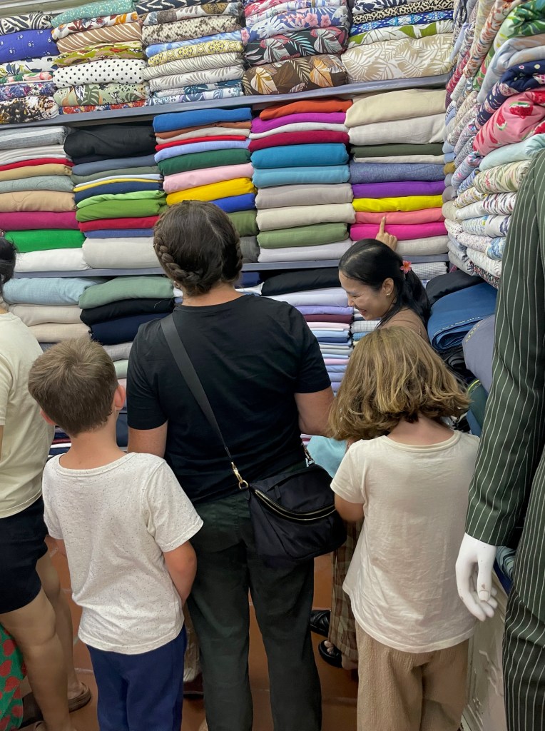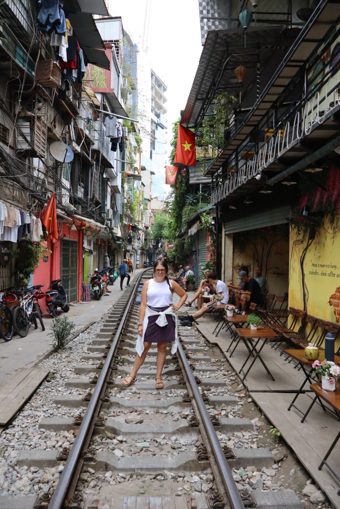 Vietnam is known for its coffee and chocolate. While the chocolate seemed to me to be similar to that of the cocoa in Costa Rica and elsewhere, the coffee was amazing. The locals love their egg coffee, which unfortunately I never mustered up the courage to try. However I enjoyed many a salt coffee and coconut coffee throughout my stay. One day in Hanoi we found ourselves enjoying a coffee and some smoothies on train street. We were with other tourists for sure, with locals selling nick knacks up and down the track. When the time came the coffee house staff came by to take down the folding tables as they did not want them to impede with the passing train. Then this concerned parent held back Little Pea, told Middle and Big Pea to lean back, and we watched the train come whizzing by. Quite an experience!