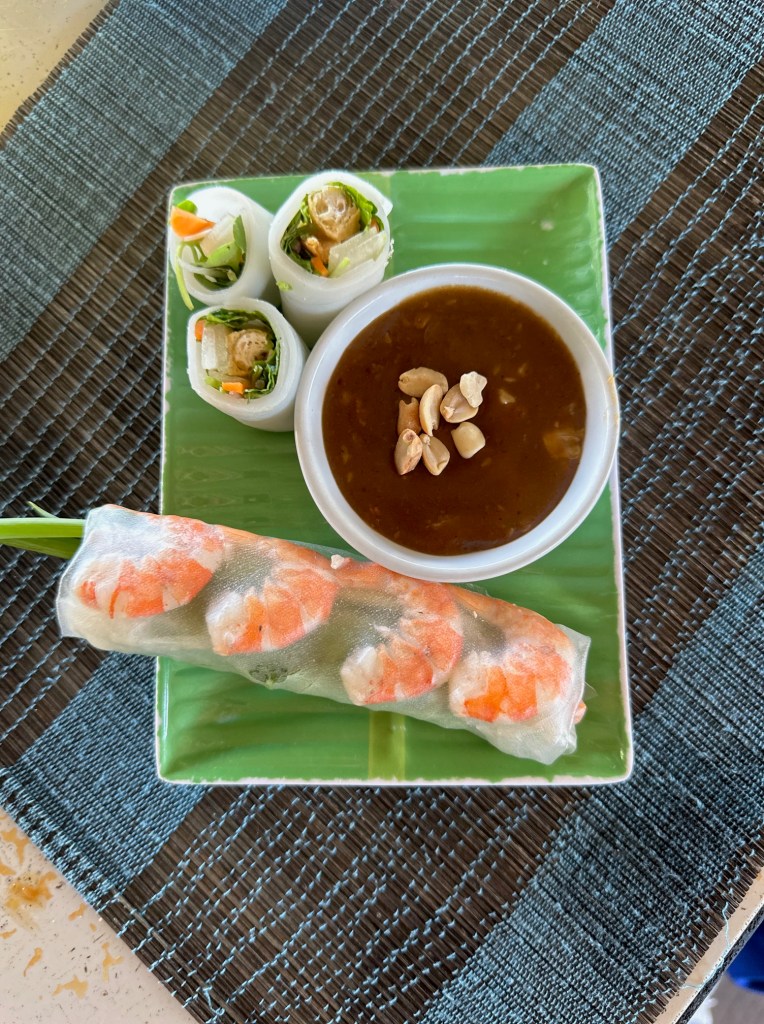 When we finished with that, we finally got to start the cooking. First, we added the spices to a boiling pot of beef bones to start the beef pho (Pho Bo). Then we watched the demonstration of making the Vietnamese spring rolls (Goi Cuon). All you do is put a bunch of herbs and shrimp in dried rice paper that you get wet. I LOVED the Goi Cuon, and I ate them all throughout the rest of our time in Vietnam. We also made a peanut hoisin sauce (Nuoc Leo) to go with the Goi Cuon.