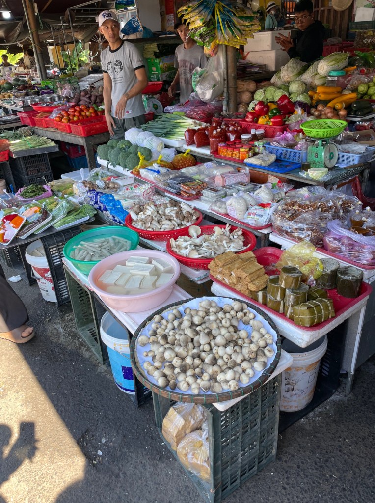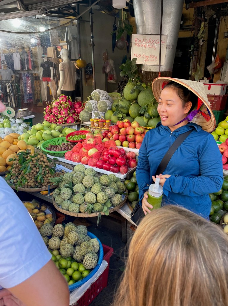 On Wednesday, we got to experience the Hoi An markets during an amazing cooking class. First, we got picked up by a bus from our Airbnb. Next, we headed to the daytime market to get the ingredients for four recipes and two dips.