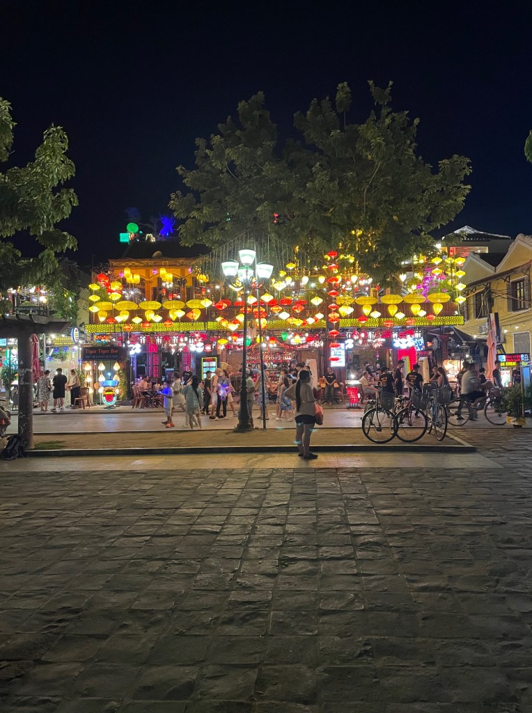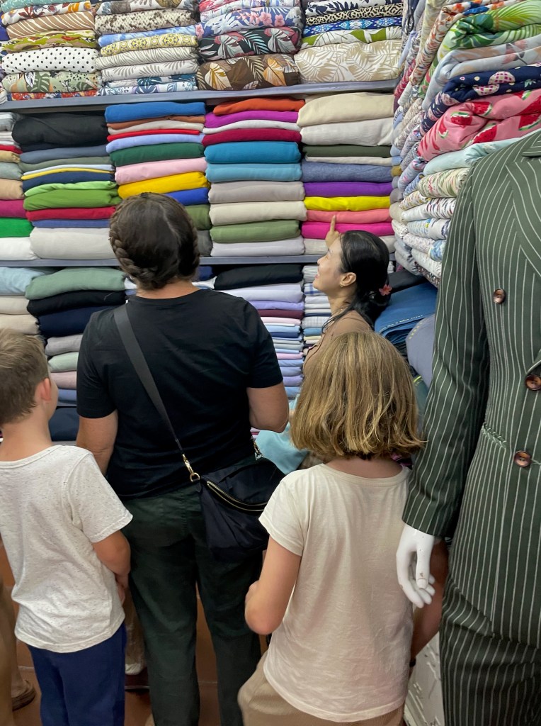 The second full day in Hoi An, we did school during the day, and in the evening we went to the Hoi An old town to walk around. We ended up going to a tailor to have handmade dresses and shirts made for me, LP, Middle Pea, Daddy Pea, and Little Pea. We got pho from a street vendor for dinner. Afterward, we strolled slowly through the old town to get to the night market! It was fun to be there; the vendors were selling all sorts of trinkets and toys. They were also selling things like handheld fans and trendy chopsticks. After we walked around for about an hour, we started going back toward our Airbnb. On the way, we stopped for some rolled ice cream and banana pancakes.