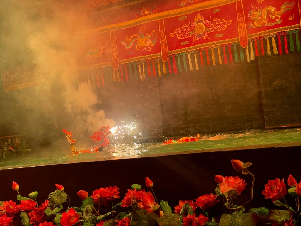 In the evening after dinner, we went to see a Vietnamese water puppet show. There was Vietnamese music, and the people backstage had long poles connected to the puppets to move them. There were multiple acts, including a dragon act where two dragons shot water and fire out of their mouths. There was also a parade act and my personal favorite, an act where the water puppets were chasing a wolf trying to eat the ducks! It was especially funny when the girl that was chasing the wolf accidentally hit the boy.