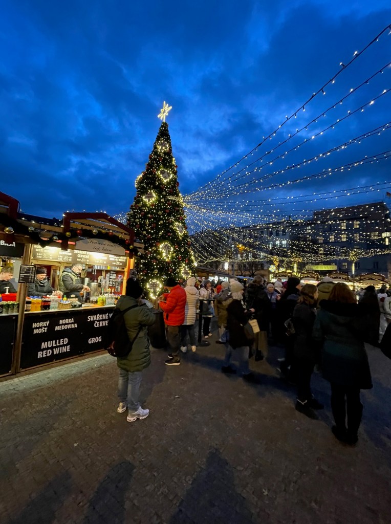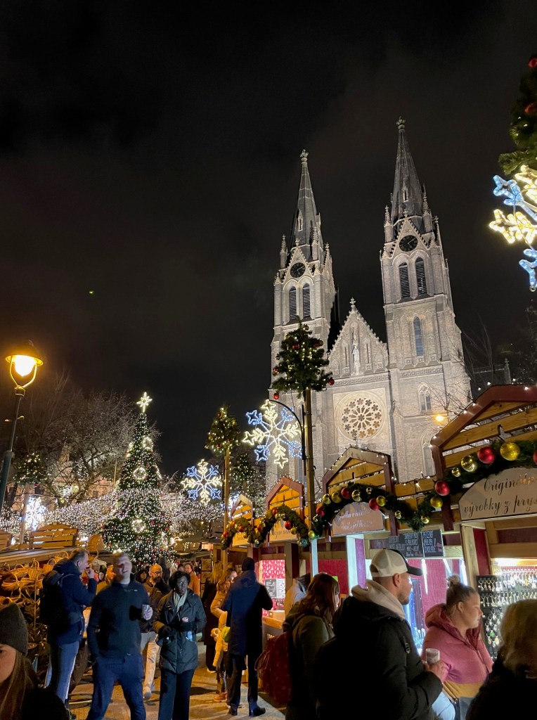 Speaking of walking, it was time for us to walk to the most anticipated place in Europe for this Christmas season, a Christmas Market! Prague’s market opened early compared to others, which typically open 30 days before Christmas. While walking to the market it started to snow, for just a brief moment. What a treat! We took it all in, enjoyed some sweet snacks, and the grownups tried some of the hot mulled wine. Even though Thanksgiving hasn’t been celebrated yet in this timeline, it was nice to get a taste of the Christmas holiday here in Prague!