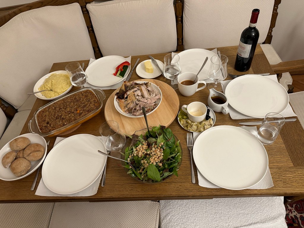 Originally, we were planning to roast a chicken for Thanksgiving. That’s the benefit of celebrating without family, there’s no one around to make you stick to old traditions just for the sake of it! I jest. Kind of. When we arrived at the store to do our shopping, they literally only had turkey. So much for that idea…We brined the 5 pound bird, smothered it with butter and enjoyed the heck out of it. We were able to purchase all the fixings we needed for a traditional dinner, and had a quiet meal at home with just us. Pretty much how we eat all our meals these days.
