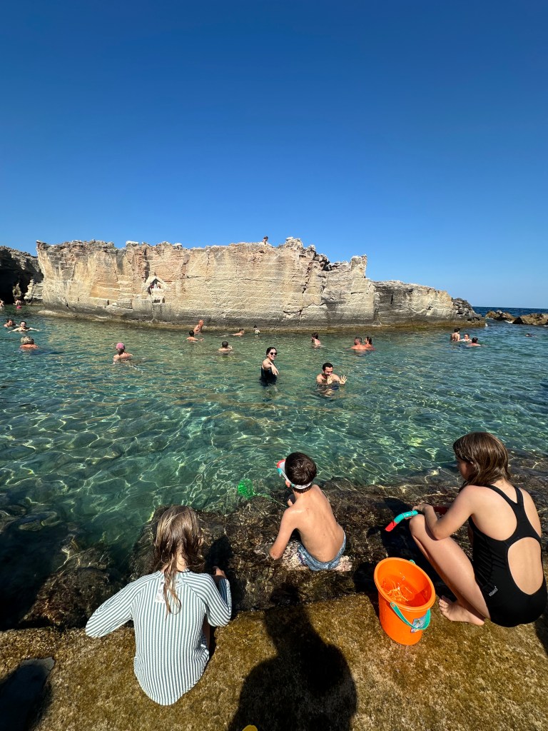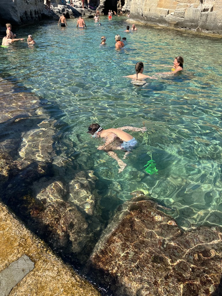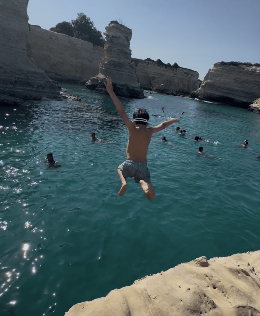 So we went. There were kids and small electric motor bikes, and we realized that an ‘aperitivo’ was a five course dinner. We stayed there till about 10:00 PM. Now I will tell you about another beach. We went there and found no sand but tall jaggedrocks that people were jumping off. And then, I jumped. The place where I jumped was about ten feet above the water. But it was about thirty-five feet down in the water. And the fish! They were everywhere! The highest I jumped was about twenty five feet high! And then, we ended the day.