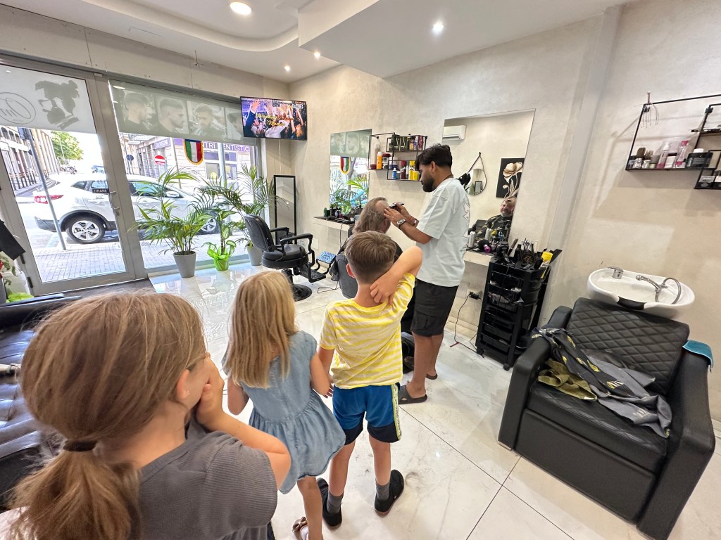 Uh-oh. This is what I’ve been watching for all along. I saved this part for last but I couldn’t hold it back. Here comes. THE ULTIMATE BALD! And so we were going to a standard Italian city called Lecce. And we were going to a barber shop. We arrived and I was first to get my hair cut. Then Dad said “take it all off.” Now, Dad had long gray hair that shot out in all directions. The person who was gonna cut it said ‘totally?’ The answer was simply “all gone.” Then, the first giant strip of hair was shaved from his head. I stared until the final piece of hair said goodbye and fell to the floor. Then, we walked to the car and drove home. And that’s what I call The Ultimate Bald.