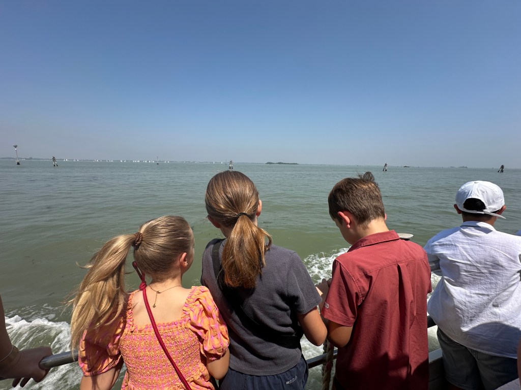 We looked at the glass blown objects in the shops and I got a little glass blown octopus. We saw a glass blowing demonstration and got to make little jewelry out of small colored cylinder columns that we put into a metal circle. Then the owner of the shop heated up the glass creations. The jewelry we made needed to be polished so we went for GELATO and I got a dark chocolate scoop in a gluten free cone. And then we walked. FAST. We walked to the water taxi stop while dad went to the workshop to get our creations. We got on the water taxi, ate dinner and ended our last night of Venice sleeping. Of course. It’s time to end our trip to Venice. Don’t say I didn’t warn you. As I said, ‘Father’s Day is the last day.’